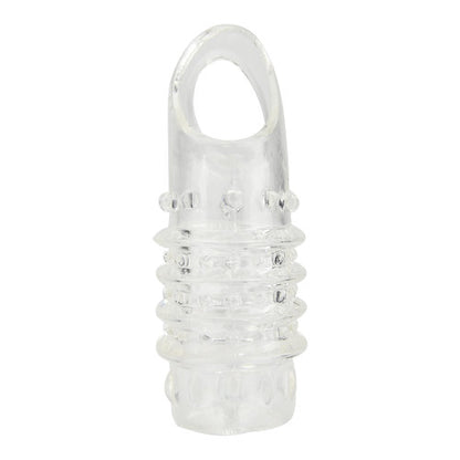 Dive into a world of enhanced pleasure with this stretchy, textured penis sleeve. The comfortable penis sleeve can boost your partner's pleasure and your girth. It features a textured design that will stimulate your partner both vaginally and anally and has a ball loop to keep the penis sleeve in place.